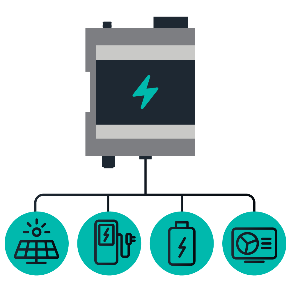 Solarpanels, Energiespeicher, Wärmepumpen, EV-Ladestationen und mehr unter Verwendung von branchenüblichen Protokollen (z. B. Modbus, DLMS, OCPP).
